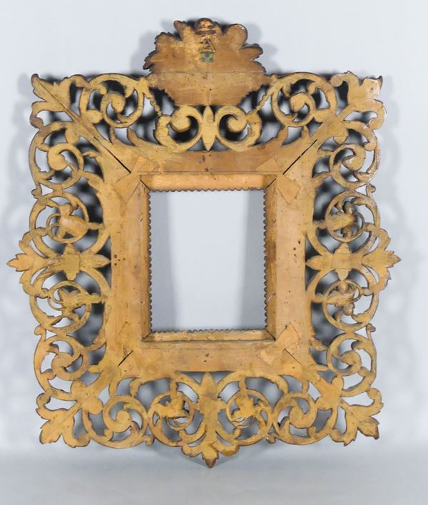 riccamente intagliata e traforata a motivi di volute floreali, sulla cimasa cesto con fiori. cm. 72,5 h x 57,5 - luce cm. 26 h x 21.