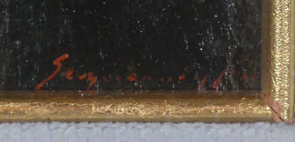 piccolo dipinto ad olio su compensato eseguito con tocco impressionista, cornicetta dorata e passepartout. cm. 18 x 11,5.