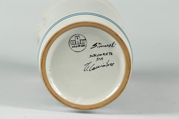 con decorazioni di fiori blu su fondo bianco. Diametro cm. 14 x 27,5 h.