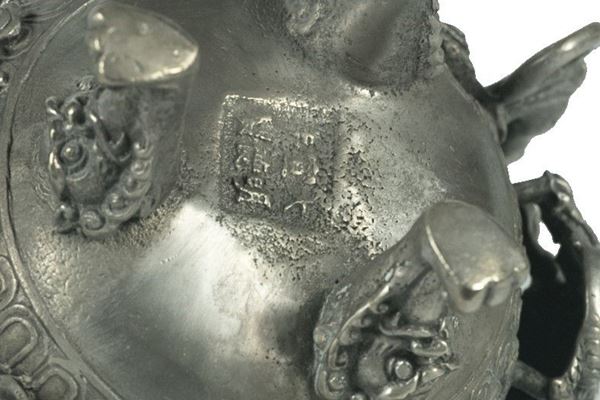 cesellato e sbalzato a motivi di draghi. Marcato. Misura cm. 17 x 16 h.