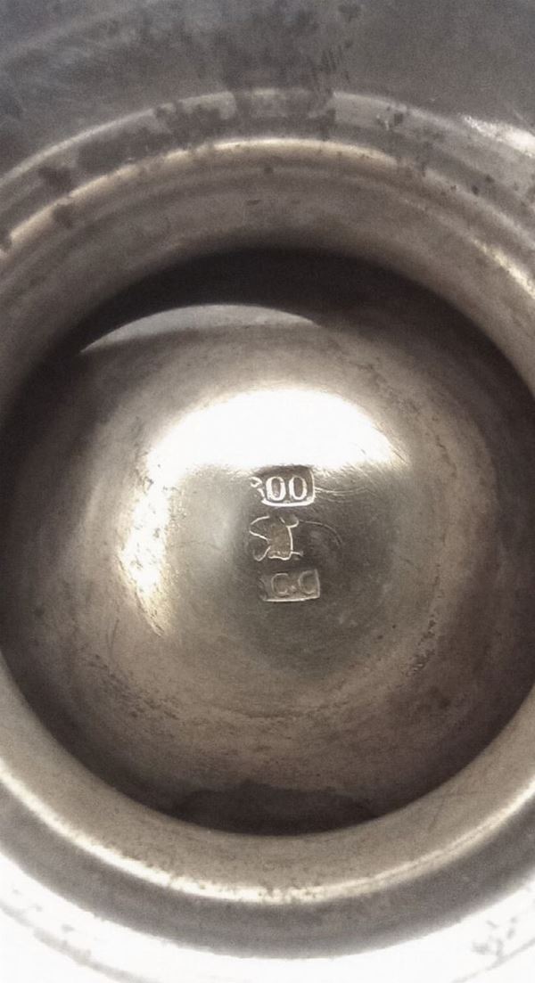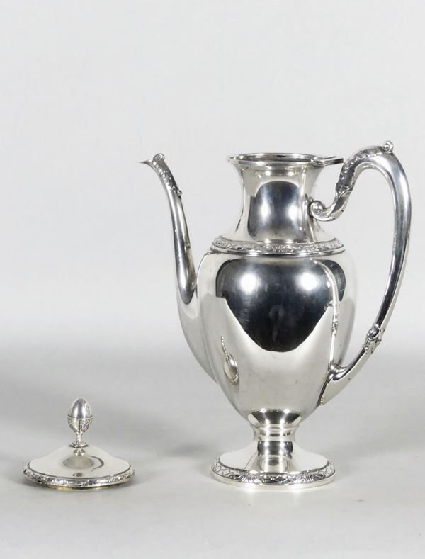 sbalzata a motivi Impero con manico e becco ricurvo. La cerniera del coperchio è difettata e presenta lievi ammaccature. Misura cm. 21 x 28 h.
