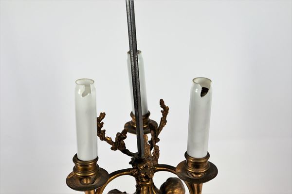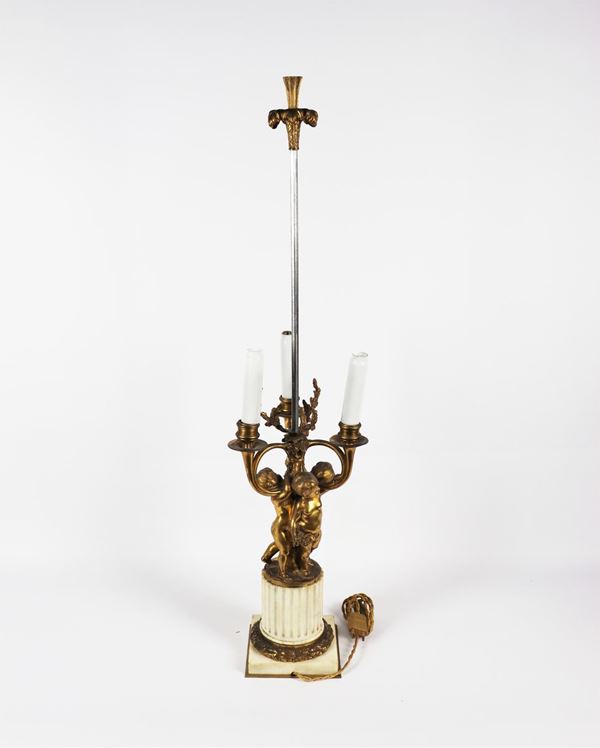 formato da tre sculture di "Putti con trombe", sorretto da base a colonna neoclassica in marmo, tre fiamme. Riduzione a luce elettrica, annesso paralume. Altezza cm. 87.