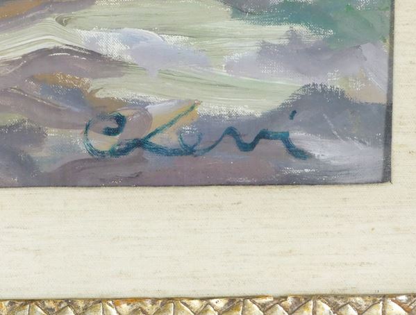 dipinto ad olio su tela. Sul retro della tela, l'artista di suo pugno ha scritto che il dipinto è stato ripreso e concluso nel 1969. Cornice in legno dorato e argentato a mecca. Misura cm. 100 x 63.