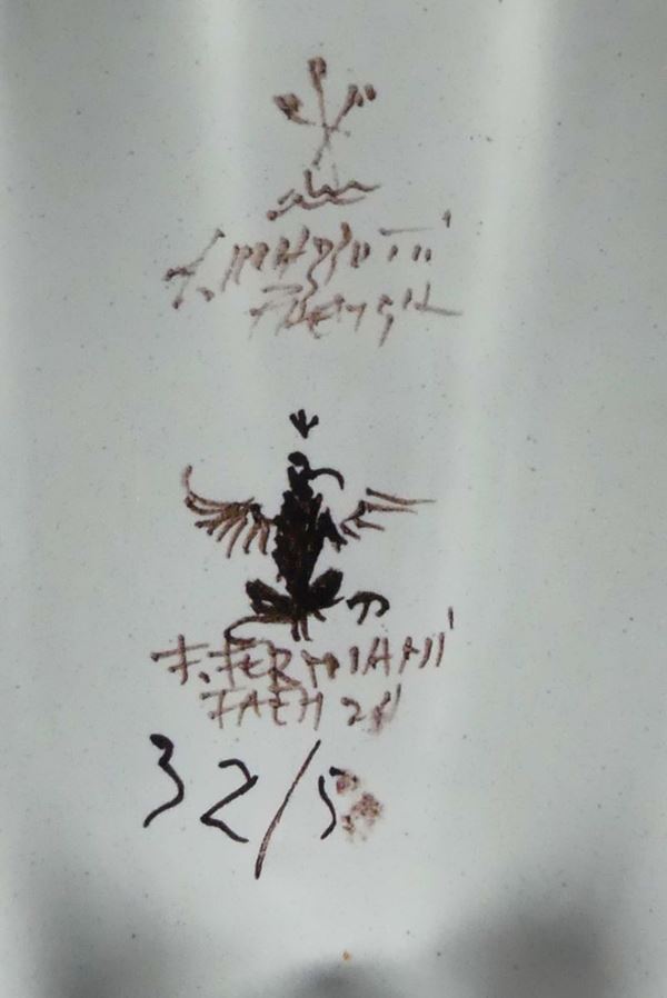 decorata con stemma gentilizio dei Conti Ferniani, decori blu sul bordo frastagliato e fondo bianco. Misura cm. 34 x 32.