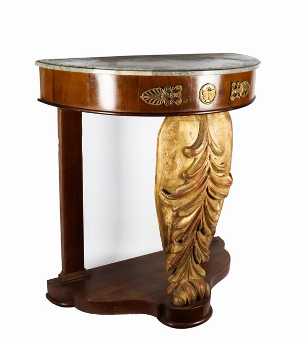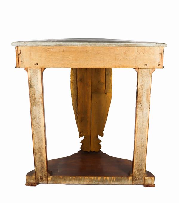 con fregi dorati ed intagliati a motivi di palmette e farfalla, tre gambe di cui una centrale in legno dorato ed intagliato. Piano in marmo grigio. Misura cm. 82 x 42 x 88,5 h.