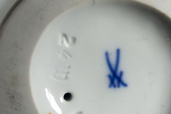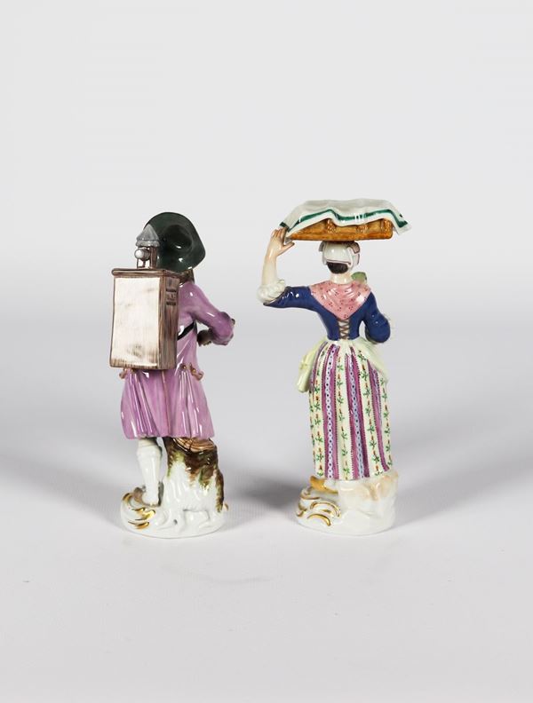 Coppia di piccole Sculture in porcellana Meissen "Suonatore di organetto e venditrice di molluschi"