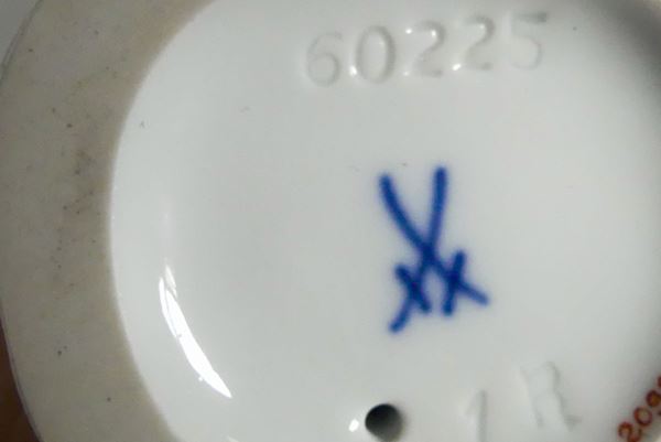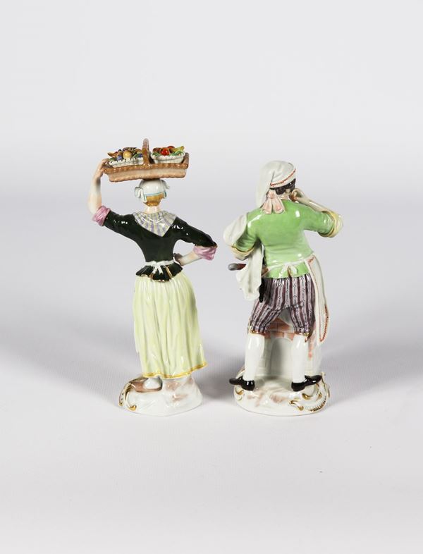 Coppia di piccole Sculture in porcellana policroma Meissen "Venditrice di frutta e cuciniere"