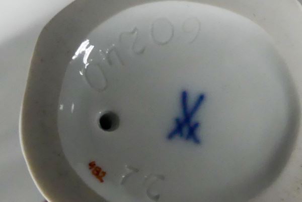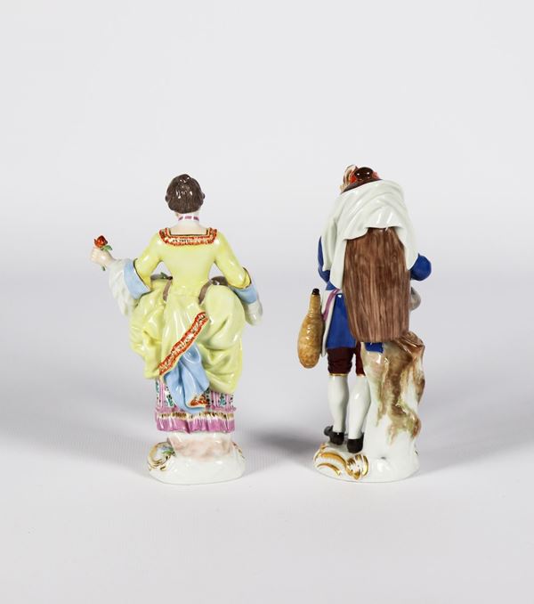 Coppia di piccole Sculture in porcellana policroma smaltata Meissen "Venditrice di fiori e acquaiolo"