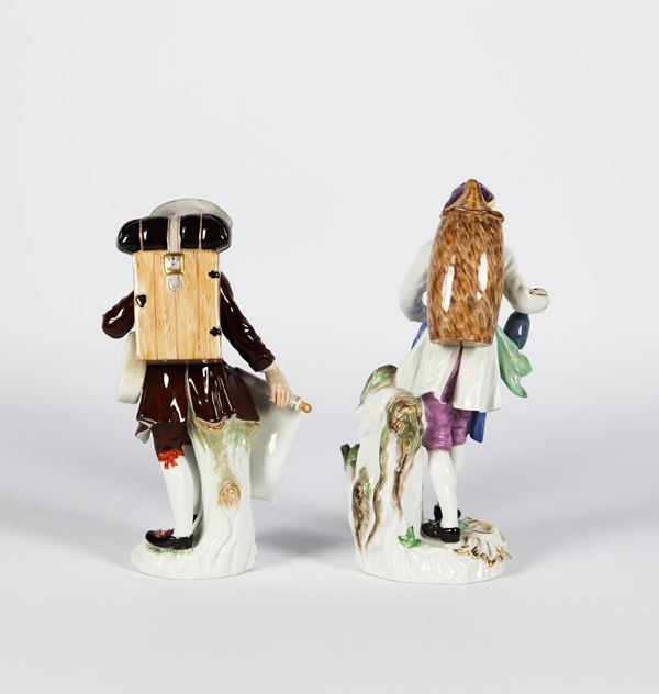 Coppia di Sculture in porcellana policroma e smaltata Meissen "Esploratore e venditore di vino"