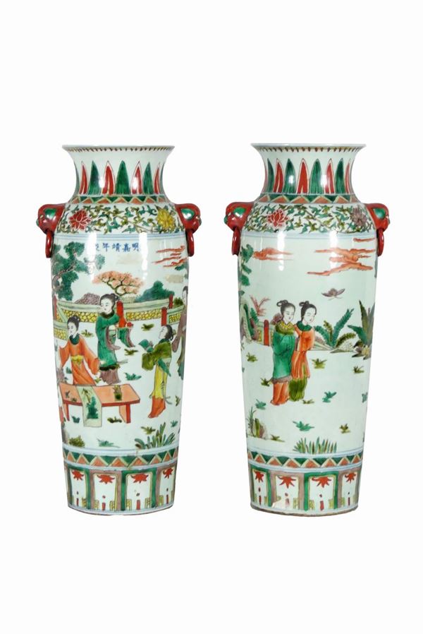 Coppia di Vasi Cinesi Famiglia Verde in porcellana smaltata a rilievo