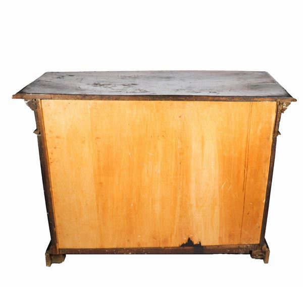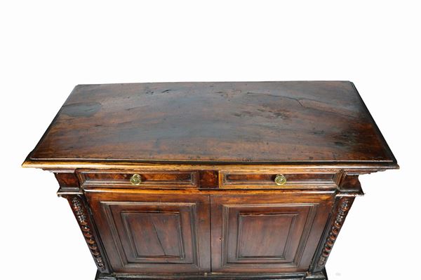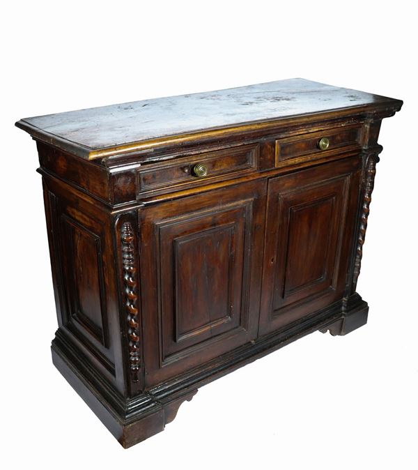 con montanti a colonnine tornite, due tiretti e due sportelli sottostanti e gambe a ciabatta. Misura cm.139 x 59 x 103 h.
