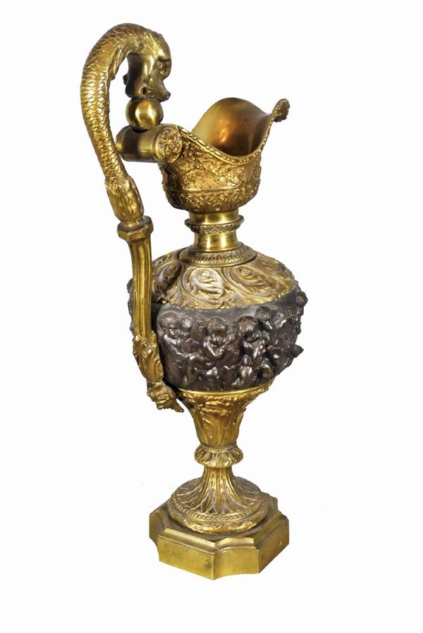 interamente lavorata ad altorilievo con baccanale di putti, foglie d'acanto e grappoli di tralci d'uva, manico a forma di testa di drago. Altezza cm. 64.