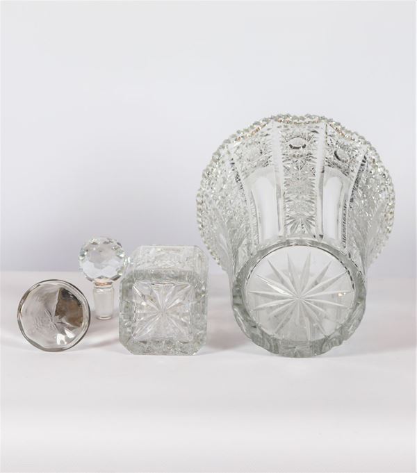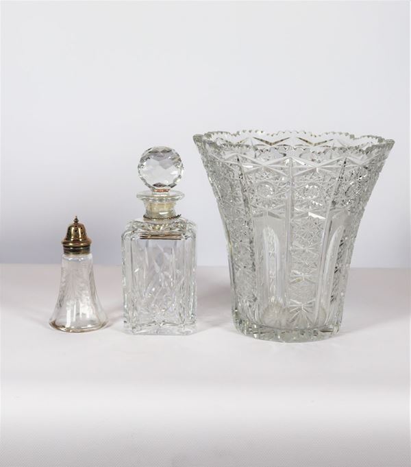 di un vaso, una bottiglia da whisky e uno spargizucchero con tappo in metallo argentato. Altezza massima cm. 26.