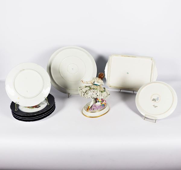 di una statuina "Ballerina", tre vassoi di cui uno rettangolare e due tondi e cinque piatti da muro. Difetti. Altezza massima cm. 20.