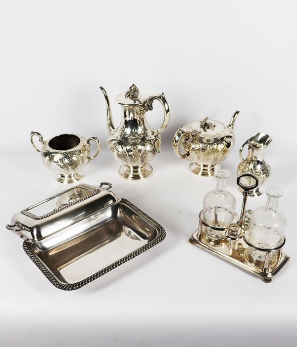 di una legumiera rettangolare, un'oliera con due ampolle in vetro ed un servizio da tè e caffè composto da: teiera, caffettiera, lattiera e zuccheriera. Altezza massima cm. 27.