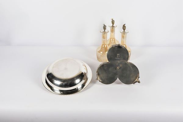 di una piccola legumiera tonda e un necessaire da tavola con tre ampolle in vetro ambrato. Altezza massima cm. 28.