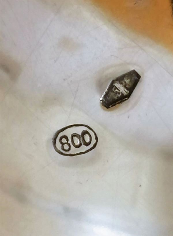 cesellata e sbalzata a motivi di baccellature con manico ricurvo e quattro piedini. Lieve difetto nella chiusura del coperchio. Misura cm. 14 x 16 h.