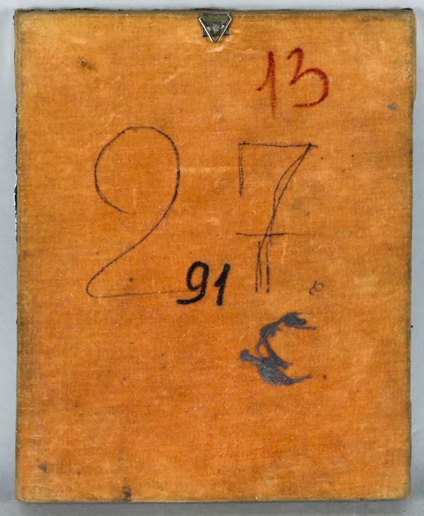 dipinta su tavola con scritte in cirillico in smalto blu. Misura cm. 18 x 23 h.