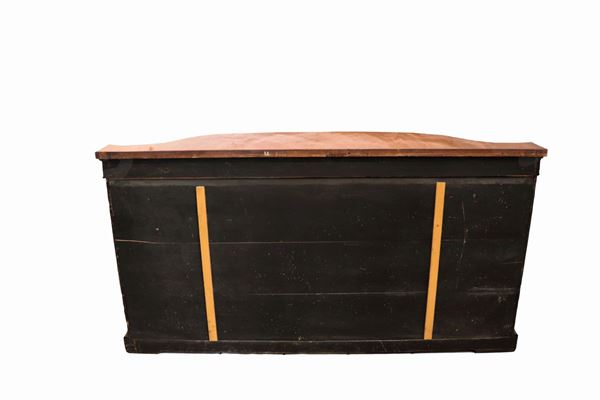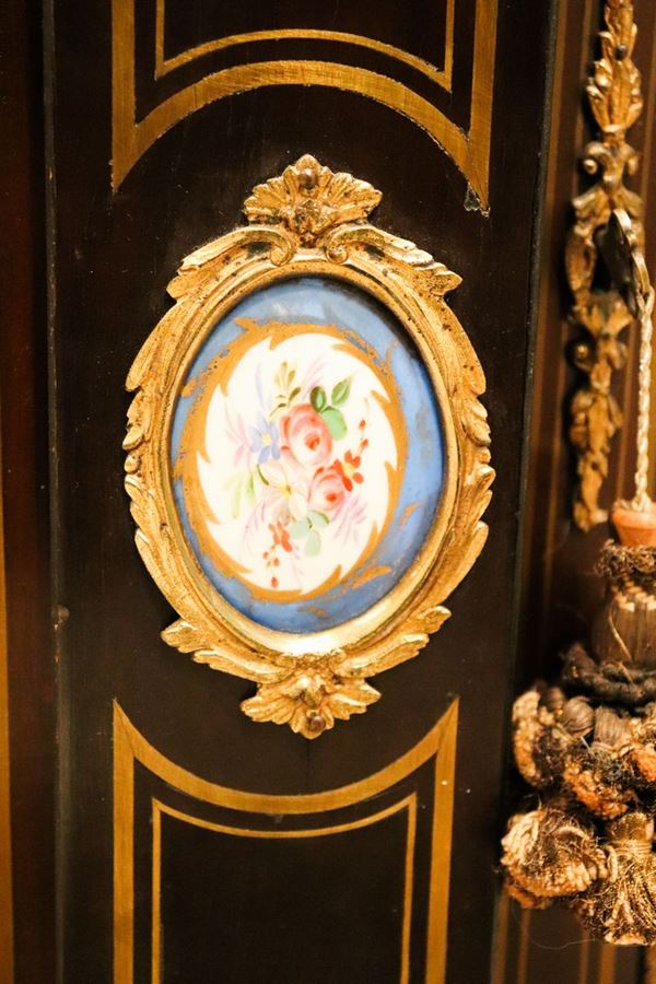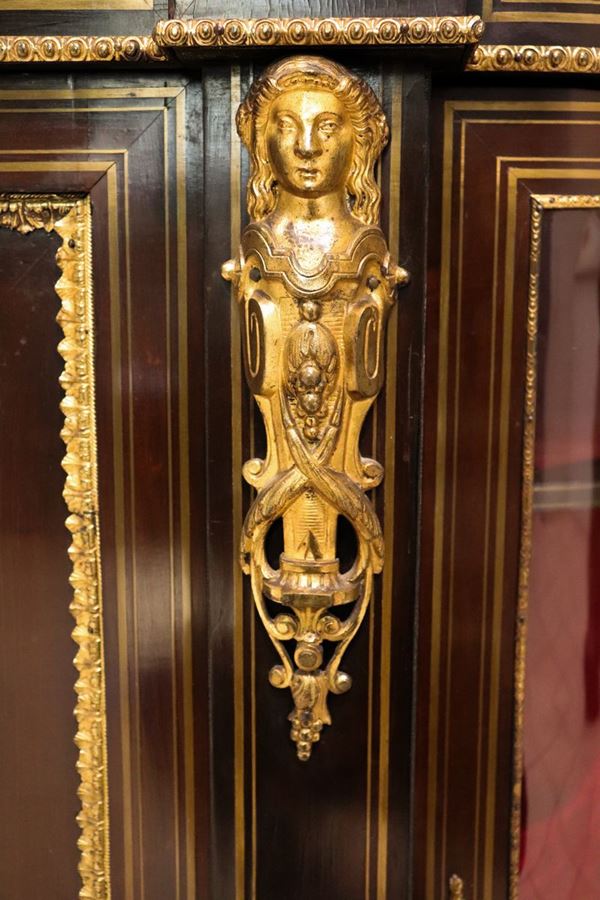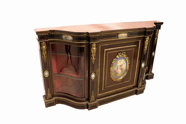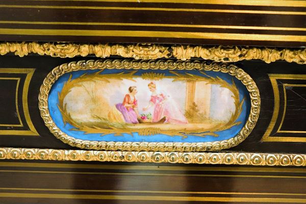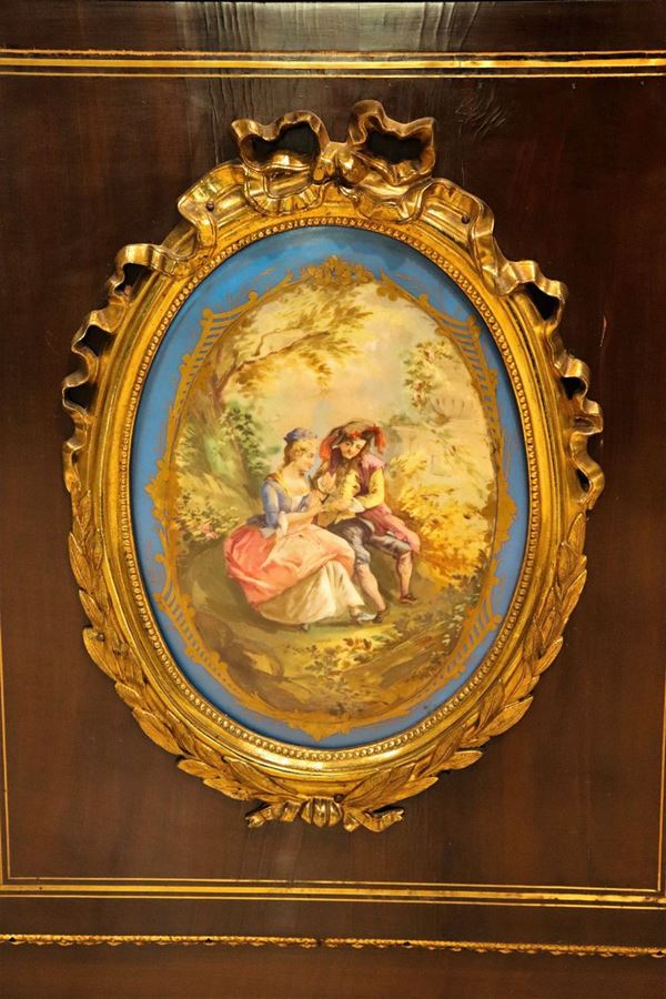con filettature in metallo dorato, medaglioni e placche in porcellana policroma di Sèvres a motivi di scene galanti e mazzetti di fiori. Fregi e sculture di cariatidi in bronzo dorato e cesellato, sportello centrale pannellato e due sportelli a vetri ai lati. Misura cm. 211 x 48 x 109 h.