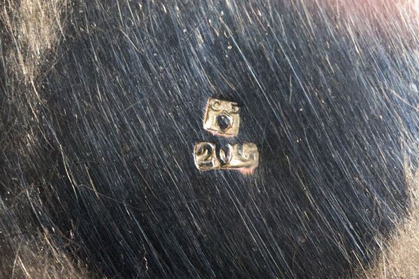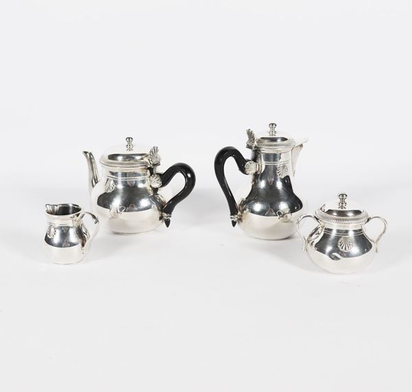 con applicazioni di conchigliette, baccellature sui bordi dei coperchi e manici in legno ebanizzato, composto da: teiera, caffettiera, lattiera e zuccheriera. Altezza massima cm. 15.