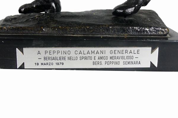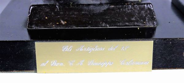 basi in marmo nero del Belgio e dedica al Generale C.A. Giuseppe Calamani. Altezza massima cm. 33.