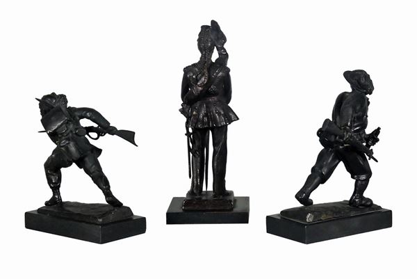 Tre Sculture "Bersaglieri e Artigliere" in bronzo patinato
