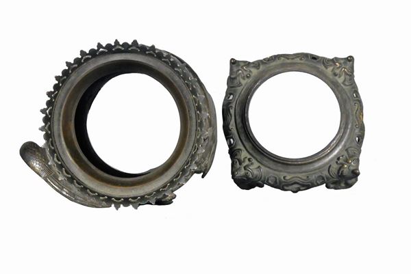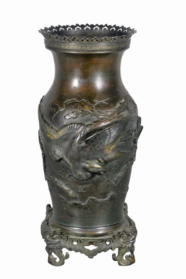 lavorato ad altorilievo a motivi di draghi e volute. Il fondo è mancante. Altezza cm. 39.