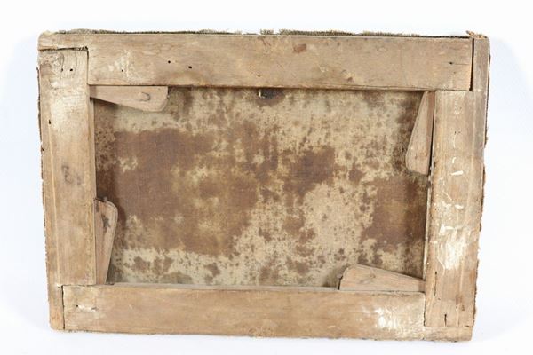 Seguace di. "Veduta di castello con porto e personaggi" piccolo dipinto ad olio su tela