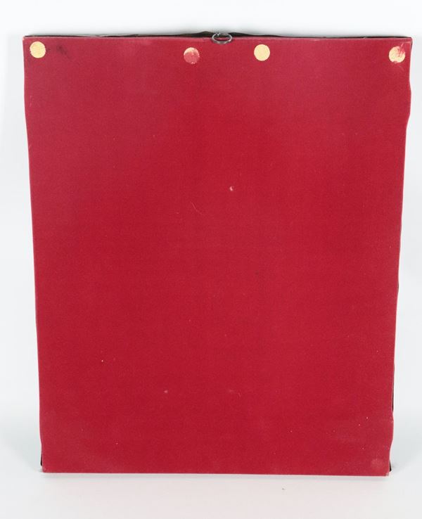 dipinta su legno con rizza in metallo cesellato e sbalzato, dorato e argentato, cm 40 x 50 h.