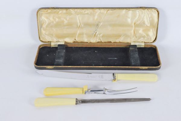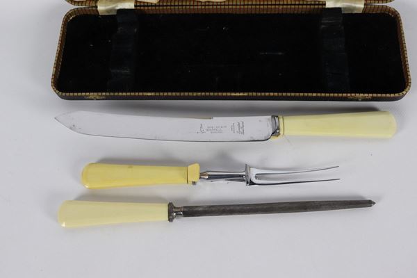 Antico set di tre posate per arrosto inglesi in sheffield con manici in osso