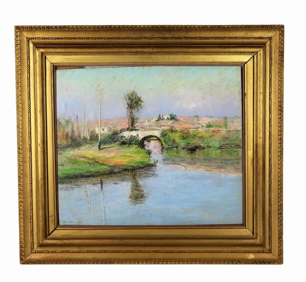 "Paesaggio collinare con ponte e corso d'acqua". Firmato, pastello su cartone