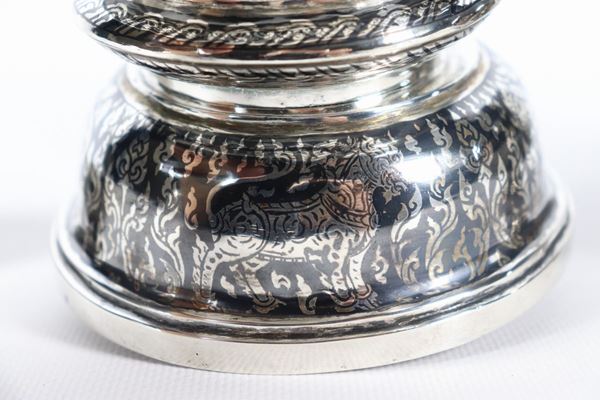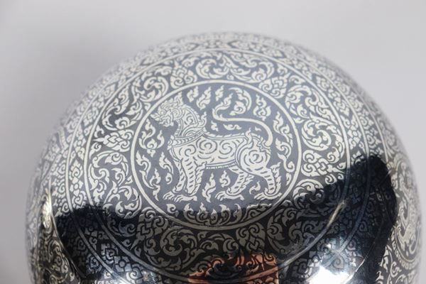 interamente lavorata a mano con smalto a niello a motivi orientali, altezza cm 23.