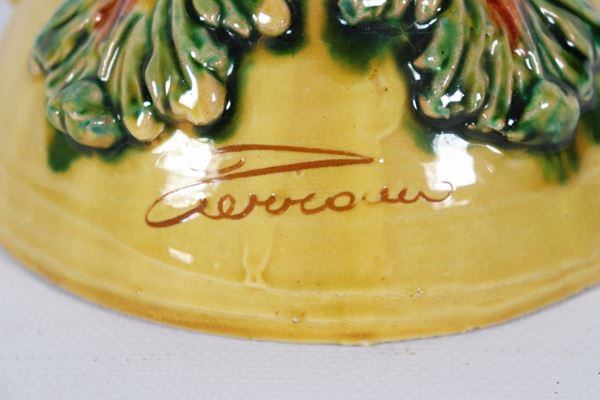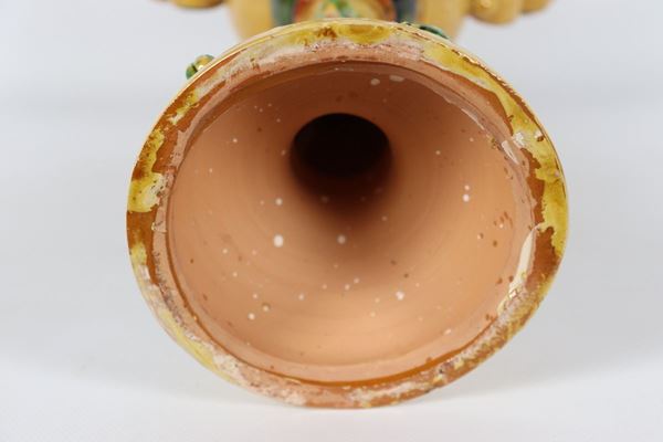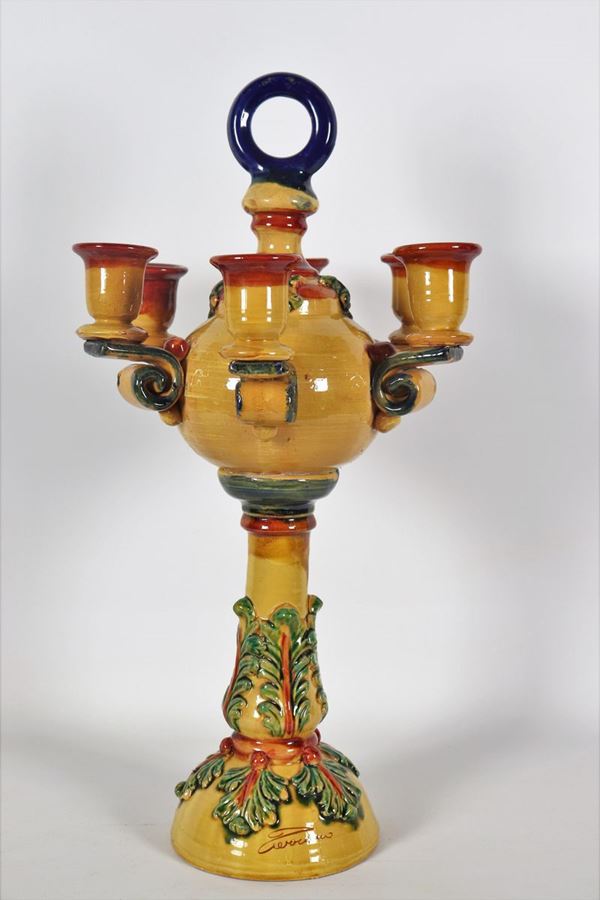 Candelabro in terracotta maiolicata e smaltata. Firmato Ferraro