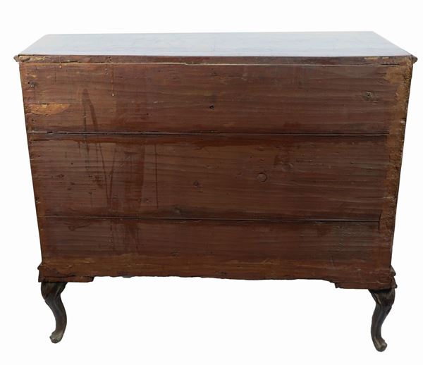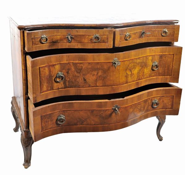 a forma mossa con filettature intarsiate in bosso, due piccoli tiretti sovrastanti e due tiretti sottostanti, quattro gambe ricurve, cm 100 x 54 x 86 h.