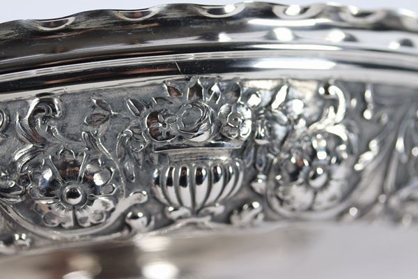 cesellate e sbalzate a rilievo a motivi di volute di foglie d'acanto, rosoni, vasi con fiori e draghi, diametro cm 26 x 9 h ciascuna.