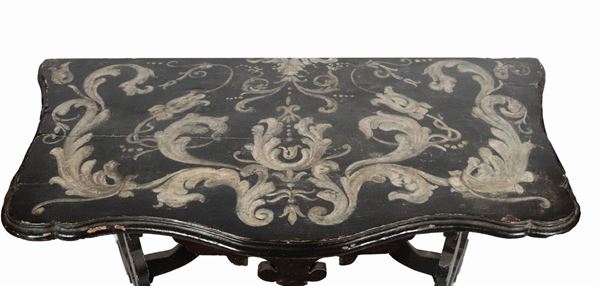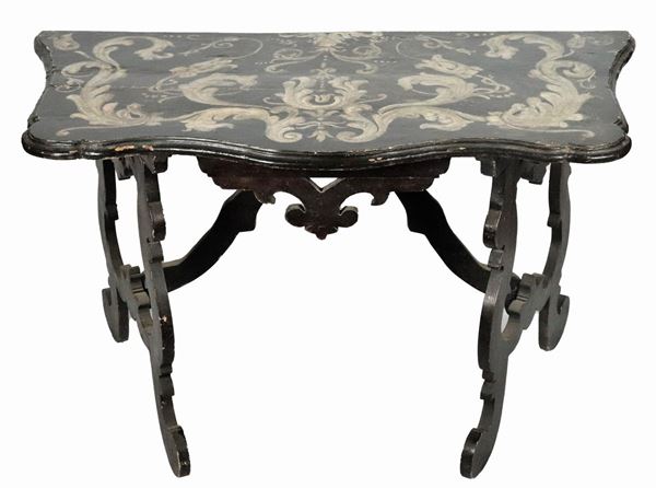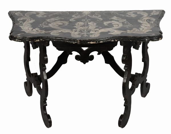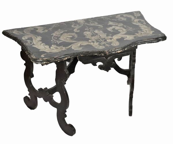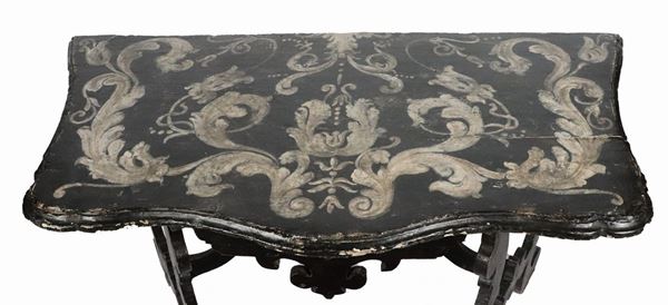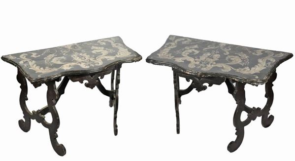 Coppia di antiche consolles di linea Luigi XIV in legno laccato nero