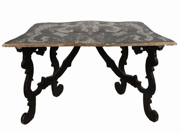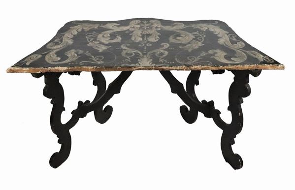 piani dipinti a motivi di volute di foglie d'acanto e fiori, gambe a lira. Difetti, da restaurare, cm 132 x 65 x 80 h ciascuna.