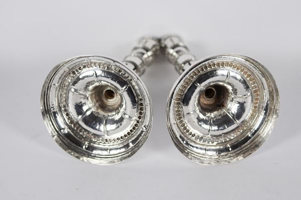 cesellati e sbalzati a scannellature e perlinature. Altezza cm 22,5 ciascuno, diametro delle basi cm 13 ciascuna.
