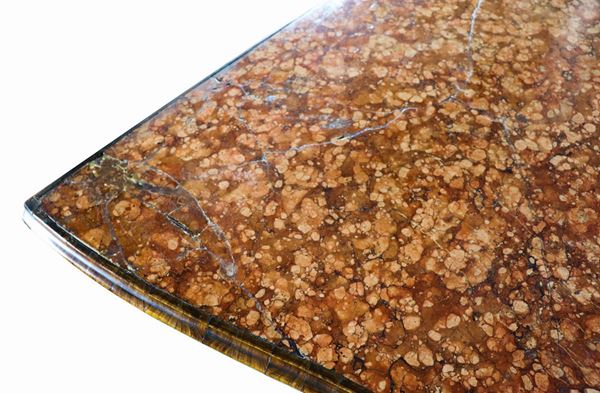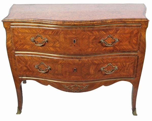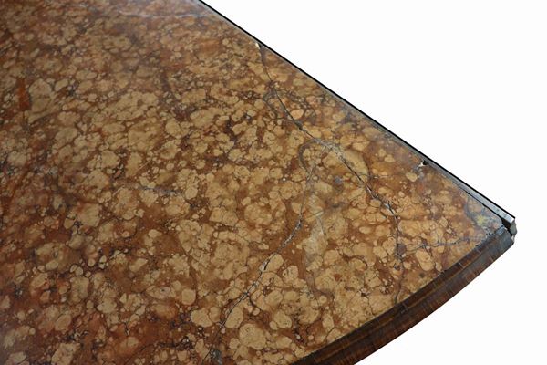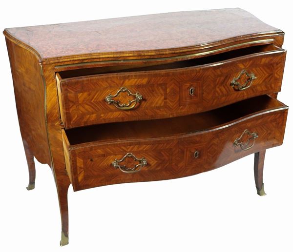a forma mossa bombata con piani in marmo incassati, due tiretti e quattro gambe ricurve. I piani in marmo presentano restauri, cm 136 x 63 x 96 h. ciascuno.