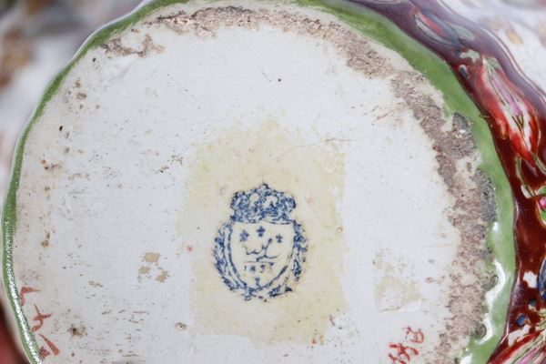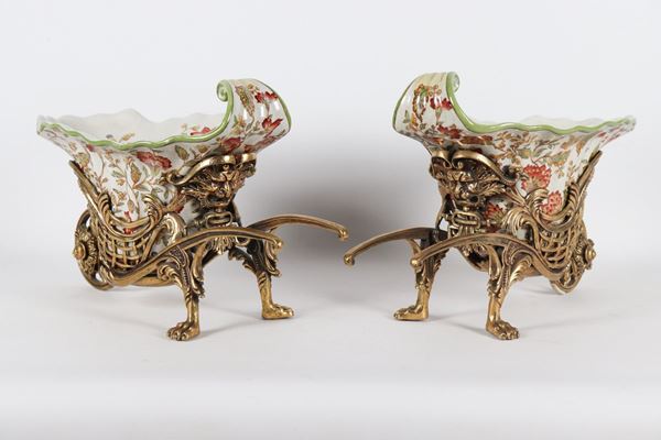 Coppia di fioriere a carriola in porcellana e bronzo dorato