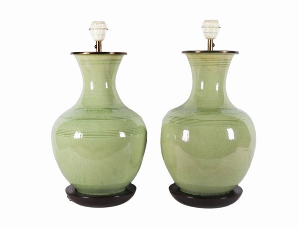 a forma di fiasca con basi in legno nero, trasformazione a lampade. Misura comprese le basi cm 29 x 43 h ciascuno.