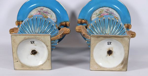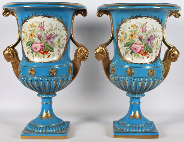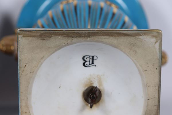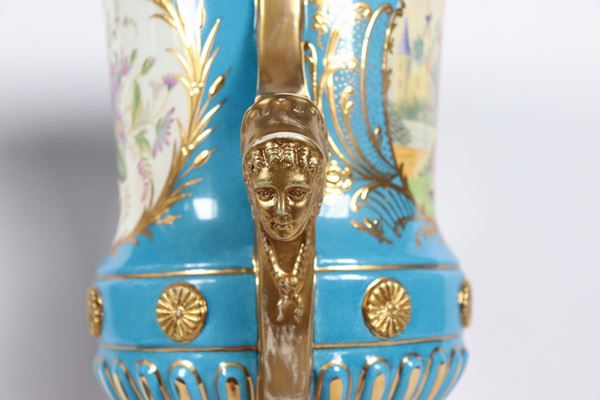 celeste e oro zecchino con medaglioni variopinti a motivi di scene galanti e mazzetti di fiori, manici a forma di teste muliebri. Cm 30 x 45 h.