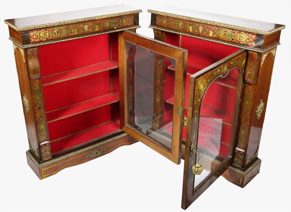 Coppia di vetrine francesi in noce, bronzo e tartaruga rossa