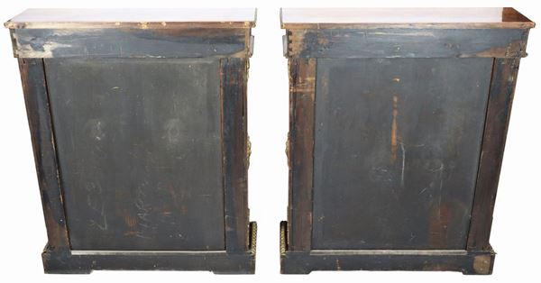 ad uno sportello ciascuna con intarsi in metallo dorato a motivi di volute e mascheroni alla maniera Boulle, fregi e guarnizioni in bronzo dorato e cesellato. Cm 82 x 22 x 101 h ciascuna.