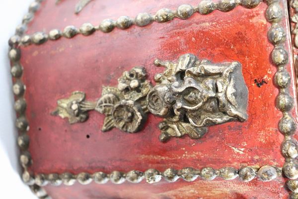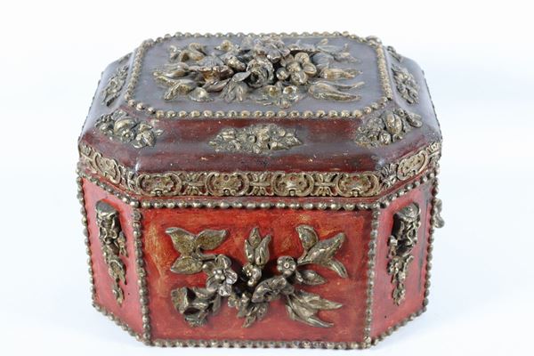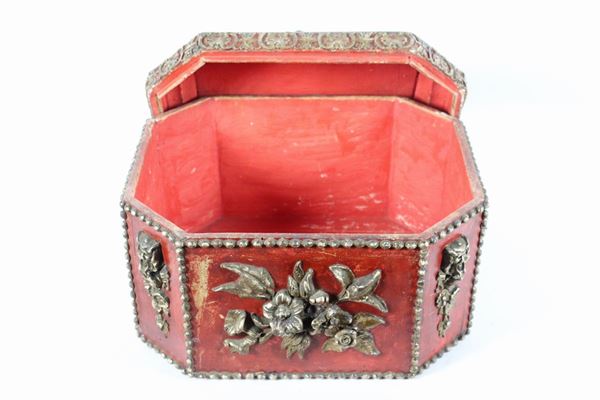 Grande scatola cinese in legno laccato rosso a forma ottagonale