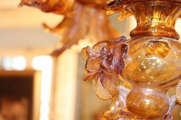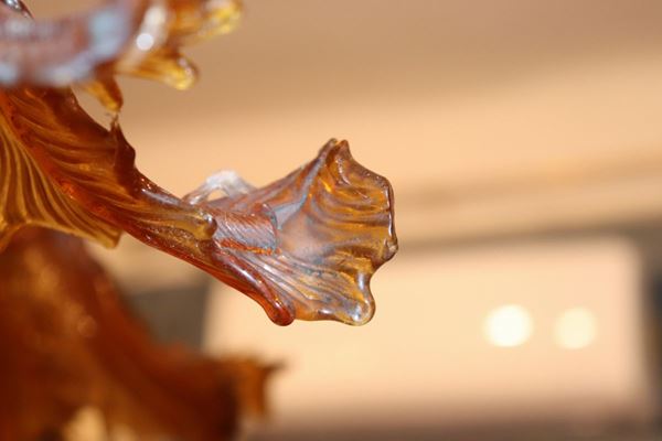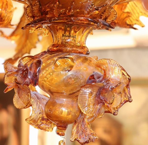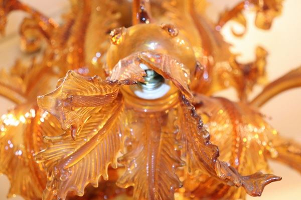 con fiori e foglie, 6 luci. Difetti con mancanze e rotture, diametro cm 95 x 110 h.