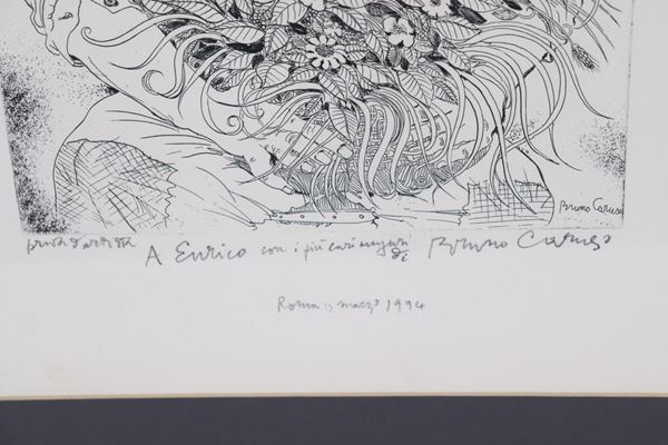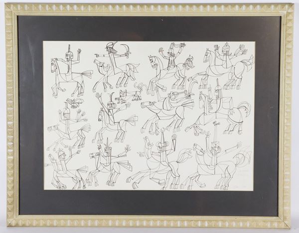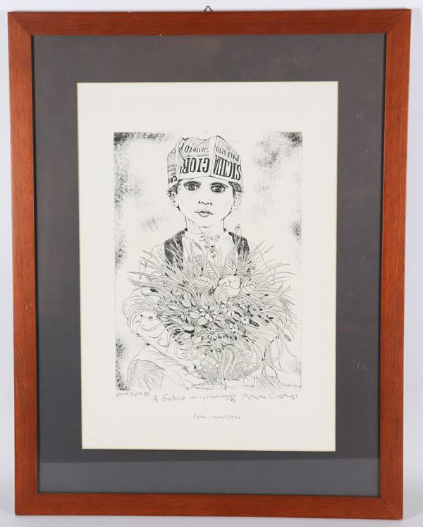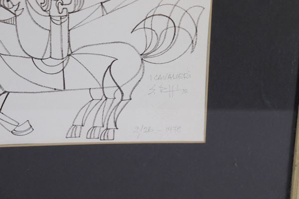Lotto di due litografie su carta "Bambino con mazzo di fiori" e "I Cavalieri"