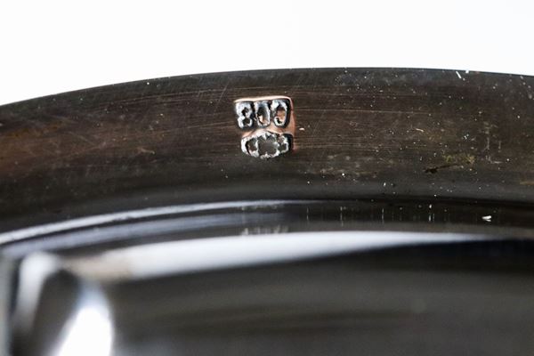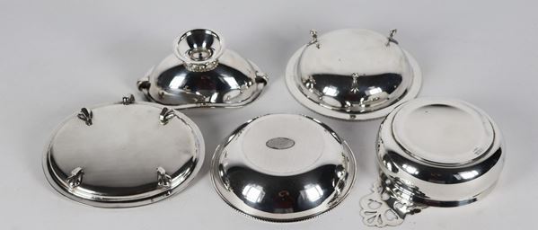 cesellato e sbalzato composto da: tre ciotole tonde, una saliera ovale e un vassoietto con manico.