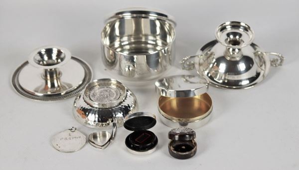 cesellato e sbalzato, composto da: una coppetta, un'alzatina, una scatola tonda, una ciotolina tonda, una scatolina tonda, tre portapillole e una medaglia.