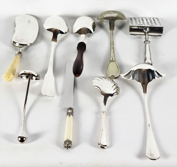 composto da: due palette da dolce, tre cucchiai da servizio, tre mestoli e un coltello per pane. Varie forme e misure.